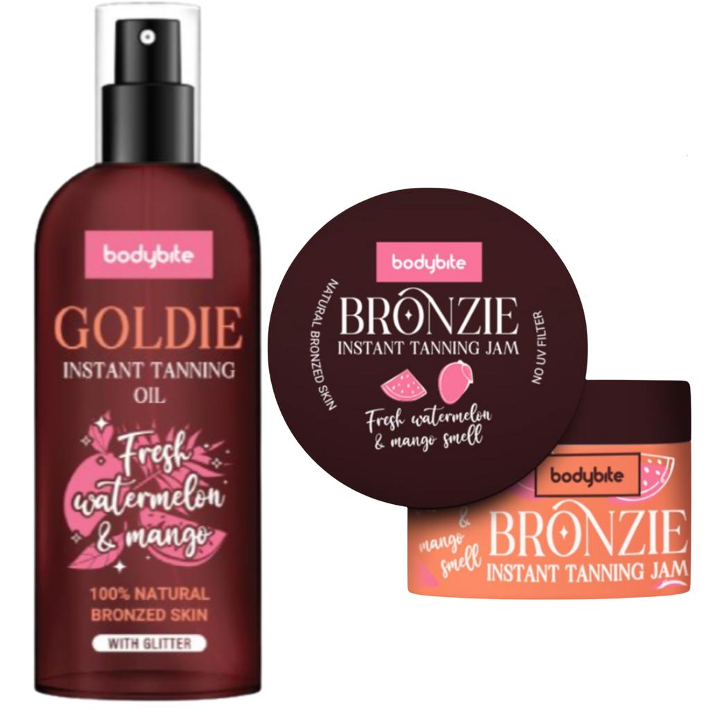 Bodybite Goldie Body Oil + Accelerator Cream Bodybite Goldie Tanning Accelerator Body Oil simultaneously nourishes your tan and skin. How does Goldie work? Goldie is a body oil that accelerates tanning and makes your tan more vibrant. It works by reacting to UV radiation, meaning it can be used outdoors or in a tanning bed. Its natural ingredients will leave your skin soft, smooth, nourished, and pleasantly scented. Plus, it will glow beautifully! From now on, your tan will look radiant like never before! How to use it? Shake before use. Apply to selected body parts before sunbathing or using a tanning bed. Goldie can also be used on the face. Note – Goldie does not provide UV protection. Use an additional sunscreen when tanning. What are its ingredients? This product is 100% vegan and silicone-free. We tested the effects of natural, long-known ingredients that aid in tanning, and that's how Goldie was created! Goldie is an oil based on the finest oils: olive oil, paraffin oil, sunflower oil, soybean oil, and wheat germ oil. Supplemented with beta-carotene and carrot extract, it ensures faster, deeper, and longer-lasting tanning results. Additionally, vitamins E and C ensure skin is in better condition before and after sunbathing. The product is not tested on animals. Ingredients: Isopropyl Myristate, Paraffinum Liquidum, Caprylic/Capric Triglyceride, Olive Oil, Sunflower Seed Oil, Beta-Carotene, Wild Carrot Root Extract, Soybean Oil, Tocopherol, Walnut, Propylene Glycol, BHT, Palm Stearate, Ascorrate, Citric Acid, Tocopheryl Acetate, Fragrance, Wheat Germ Oil, Mica, Propylparaben, Benzyl Benzoate, Limonene, Linalool, CI 12010, CI 77891, CI 77491 Distributor: HS plus d.o.o., Gmajna 10, 1236 Trzin, Slovenia Bodybite Bronzie Tanning Accelerator Cream Bronzie ensures a faster tan and moisturized skin! Accelerates the tanning process. Deeply moisturizes and nourishes the skin. Fast-absorbing formula. Can I use it in a tanning bed? Absolutely! Bronzie Marmalade is activated by UV rays, regardless of whether you're sunbathing in the sun or in a tanning bed. Is it waterproof? Yes, you can safely swim in the sea or pool between sunbathing sessions. How does the tanning marmalade work? When exposed to UV rays, Bronzie stimulates melanin production, allowing the skin to tan faster. Bronzie accelerates the natural tanning process while deeply moisturizing the skin, leaving it smooth, soft, and hydrated. What are the ingredients? Carrot extract – as a source of beta-carotene, accelerates tanning and prolongs its effects. Cocoa butter – gives the skin a golden glow. Organic shea butter – moisturizes, softens, and smooths the skin. Our product is not tested on animals. The capacity of one bottle is 200 ml. Does the product provide sun protection? Bronzie does not contain sunscreens and does not protect against solar radiation during prolonged exposure. Before prolonged sun exposure, it is recommended to apply SPF. Excessive sun exposure is very harmful to your health. Long expiration date. Capacity: 200ml. Ingredients: Petrolatum, Isopropyl Myristate, Theobroma Cacao Seed Butter, Cera Alba, Parfum, Paraffinum Liquidum, Olea Europaea Fruit Oil, Butyrospermum Parkii Butter, Juglans Regia, Helianthus Annuus Seed Oil, Beta-Carotene, Daucus Carota Sativa Root Extract, Glycine Soolja Oil, Propylparaben, Propylene Glycol, BHT, Ascorbyl Palmitate, Glyceryl Stearate, Citric Acid, Citral, Limonene, Linalool, CI 12010.
