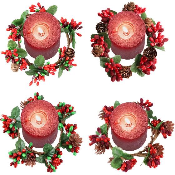 MINI BERRY CANDLE RINGS: Small berry garland interior dimensions 2.6-2.8 inch, suitable for candles less than 2.5in in diameter. Each group contains pine cones, a crimson stamen with small crystal grains and a bright red stamen on the outside, with a triangular leaf underneath.