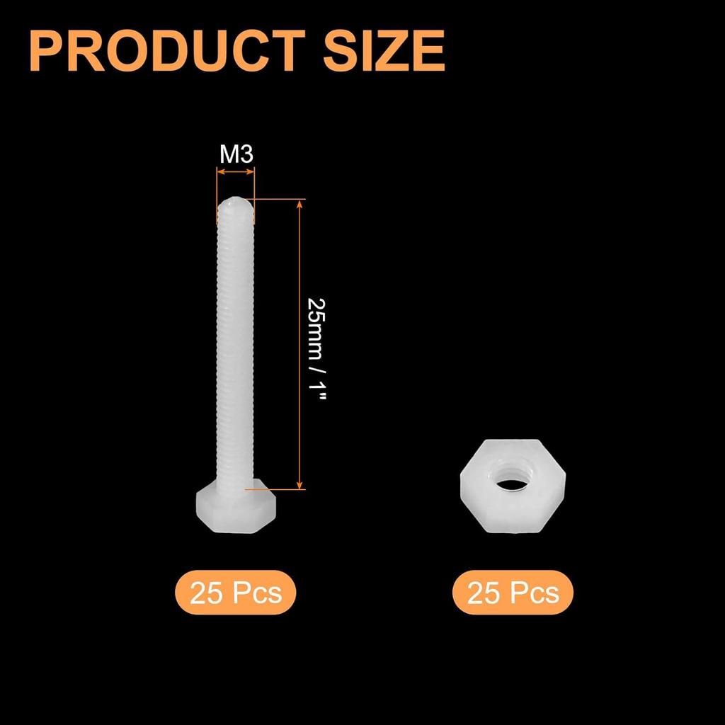 Uxcell 25 Pair Nylon Screws Nuts Assortment, M3x25mm Hex Screws Bolts and M8 Hex Nuts for Machinery Electronics Industrial Accessories, White