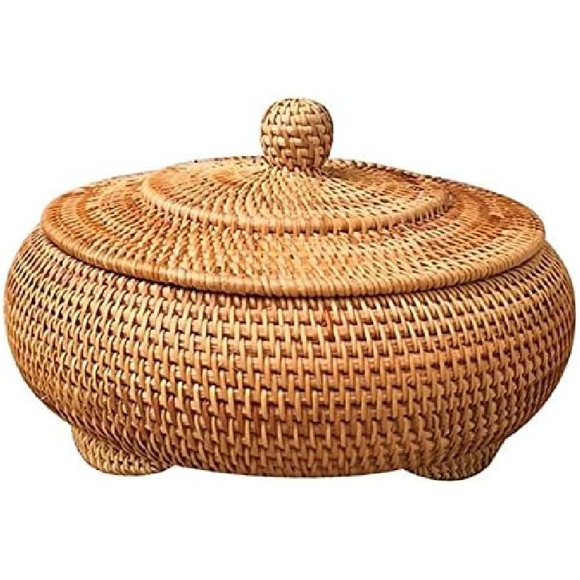 Round Rattan Boxes with Lid Hand-Woven Multi-Purpose Wicker Tray 11 Inch Picnic Food Bread Table Storage Basket (28x13cm)
