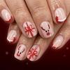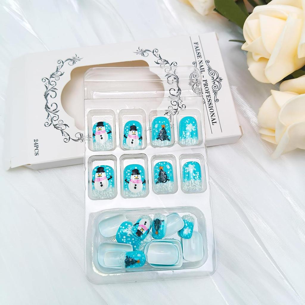Christmas Snowmen Press On Nails Short Square French Tip Fake Nails with Winter Snowflake Design Blue Winter Xmas Snowmen Glue On False Nail