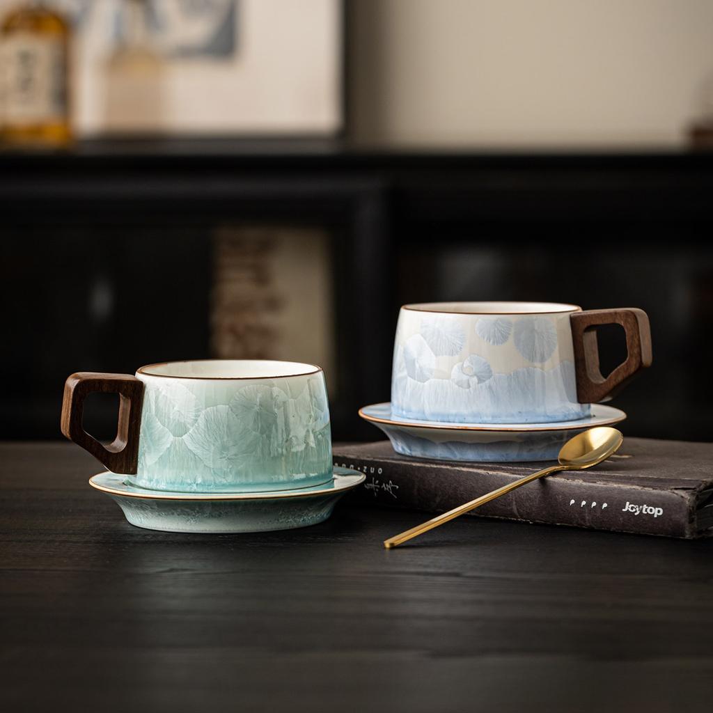 Chinese Style Wooden Handle Ceramic Mug with Dish Crystalline Glaze Coffee Cups Afternoon Tea Cup Set Household Drinkware