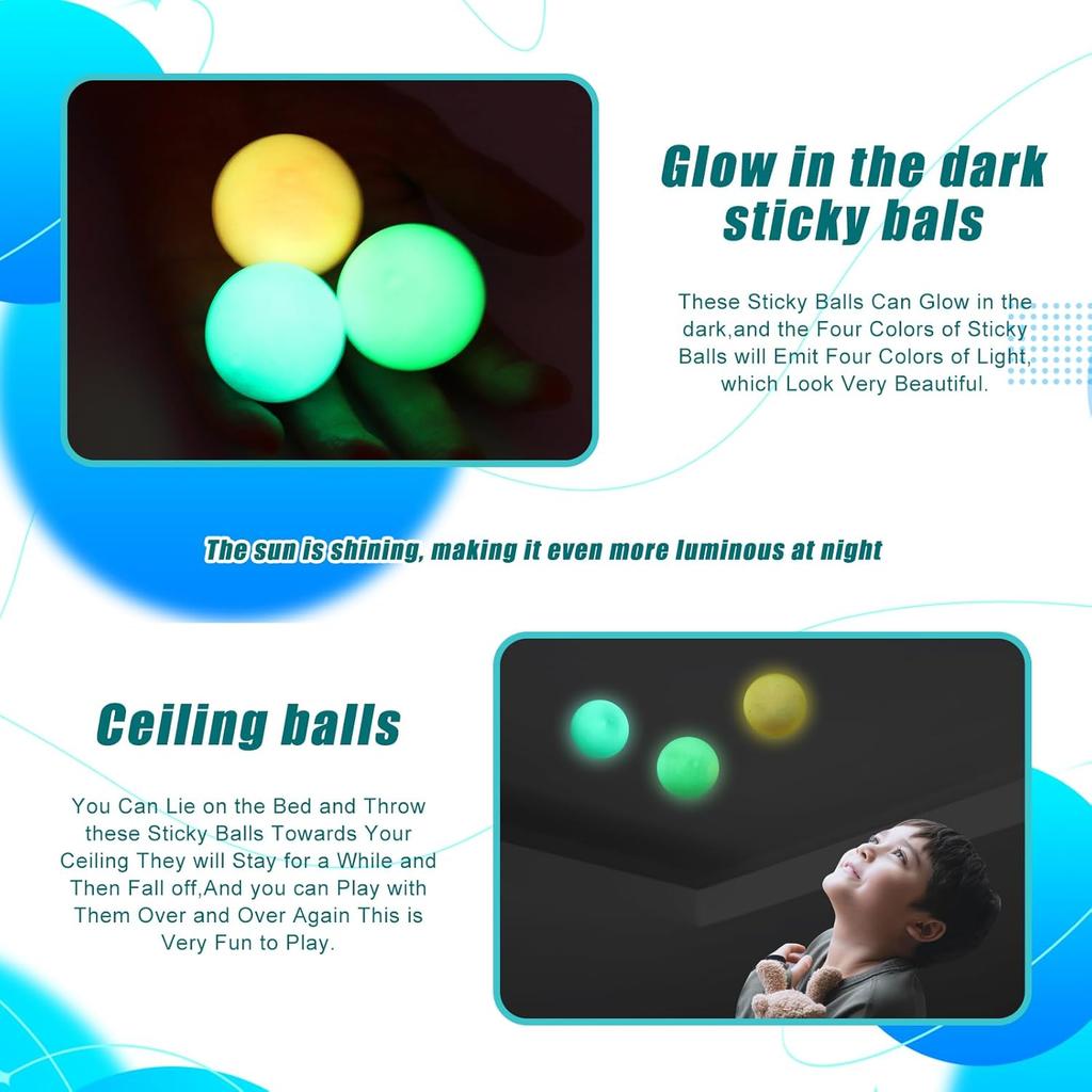 【throwing toy】 Note: just bought the ball do not throw to the ceiling, will stick to the above, play a few minutes after the ball is not so sticky then throw.【Good sticky】Glowing sticky lumiballs that stick to the ceiling has a good stickiness, throw it to the ceiling or wall, wait for the ball to fall slowly, and then catch it (the stickiness is very good, it may stick for a long time or not fall, need parents help to remove it ).