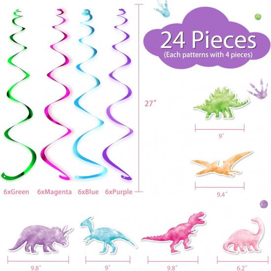 - PACK CONTENT - 24pcs dinosaur hanging swirls, including 4 x Tyrannosaurus, Stegosaurus, Triceratops, Brontosaurus, Spinosaurus, Pterosaurs.