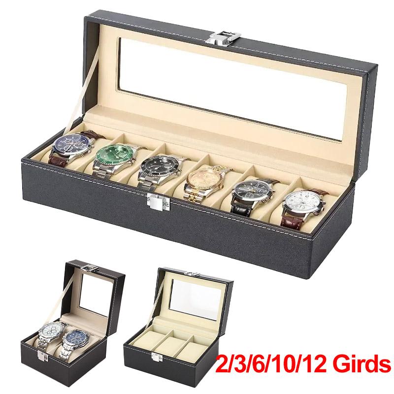 Hot Sale PU Leather Display Storage 2/3/6/10/12 Girds Collection Organizer Watch Box For Men Watch Display Case With Glass Top