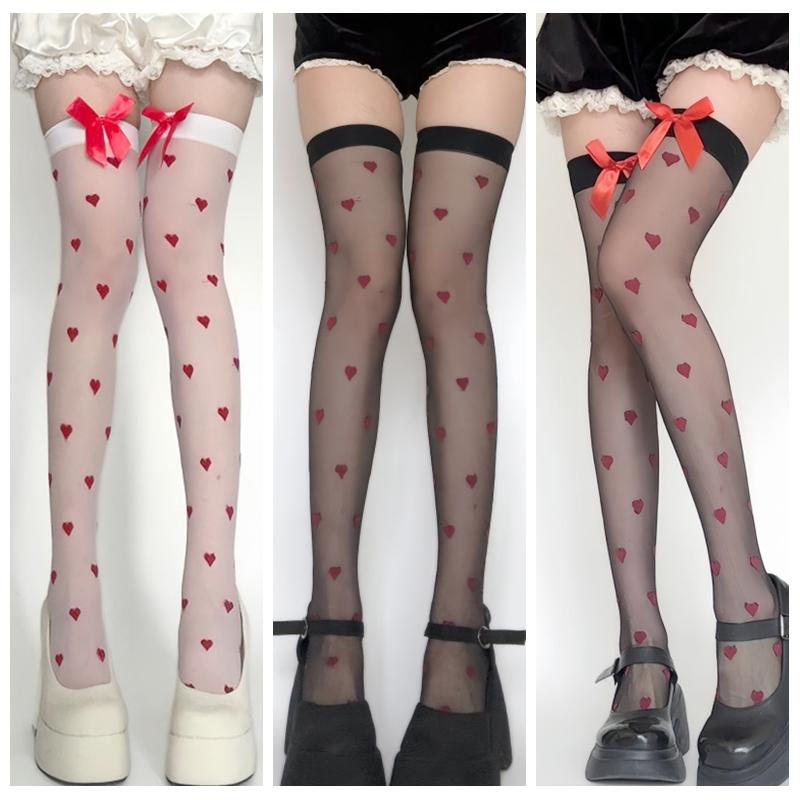 JK White High Tube Socks Love Heart Printing Stockings Fashion Sexy Lolita Elastic Sock Girls Red Butterfly Knot Long Stocking