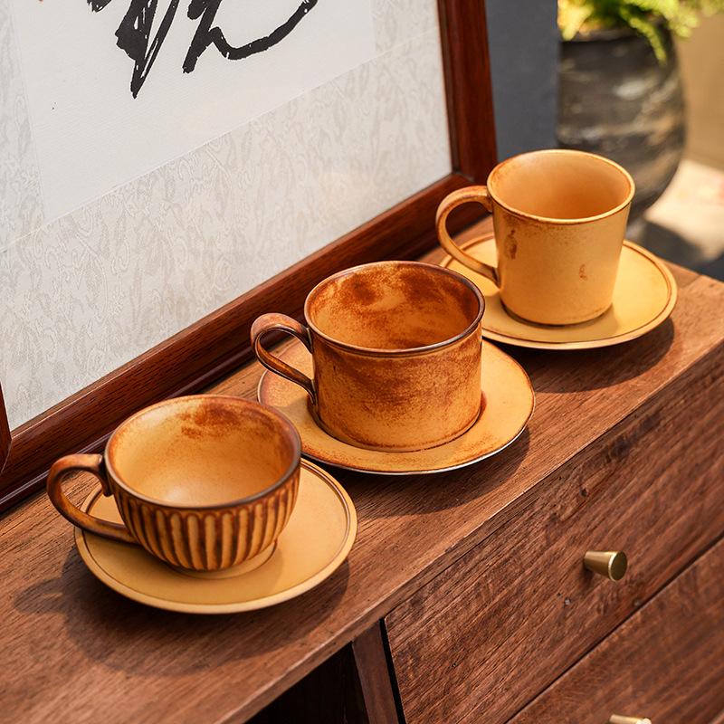 Color: kiln yellow - general coffee cup capacity of about 280ml, kiln yellow - hat coffee cup capacity of about 210ml, kiln yellow - petal coffee cup capacity of about 200ml, rock brown - origami coffee cup and saucer set capacity of about 200ml, gilt - origami coffee cup and saucer set capacity of about 200ml, turquoise - origami coffee cup and saucer set capacity of about 200ml, gradual change blue - macaron coffee cup and saucer set capacity of about 150ml, gradual change powder - macaron coffee cup and saucer set capacity of about 150ml, white - vertical pattern coffee cup and saucer set capacity of about 195ml, black - vertical pattern coffee cup and saucer set capacity of about 195ml, gray - vertical pattern coffee cup and saucer set capacity of about 195ml, coffee - vertical pattern The capacity of the coffee cup and saucer set is about 195ml, and the capacity of the gilt-vertical coffee cup and saucer set is about 195ml.