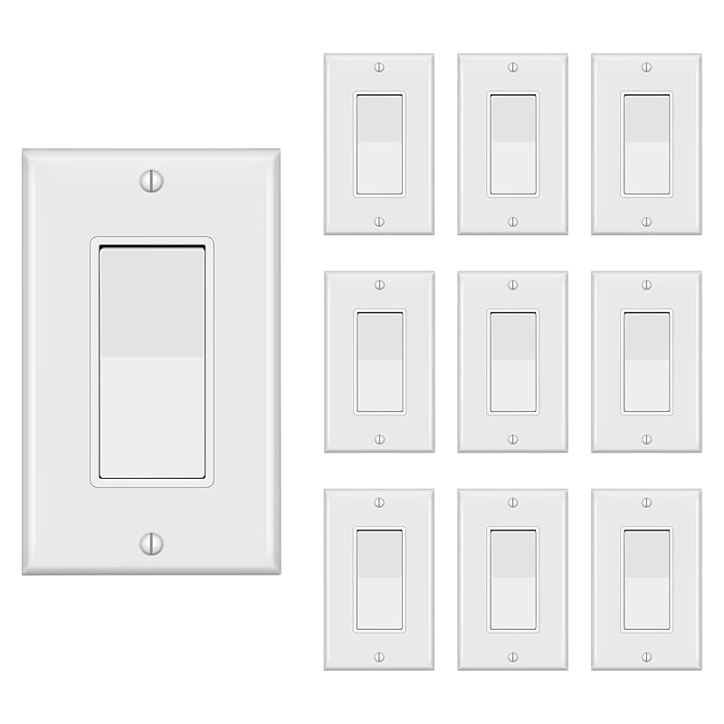 3 Way Decorator Switch with Wall Plate, Electrical Rocker Light Switch, Single Pole or Three Way, 3 Wire, 15A 120V/277V, UL Listed, White (10 Pack)
