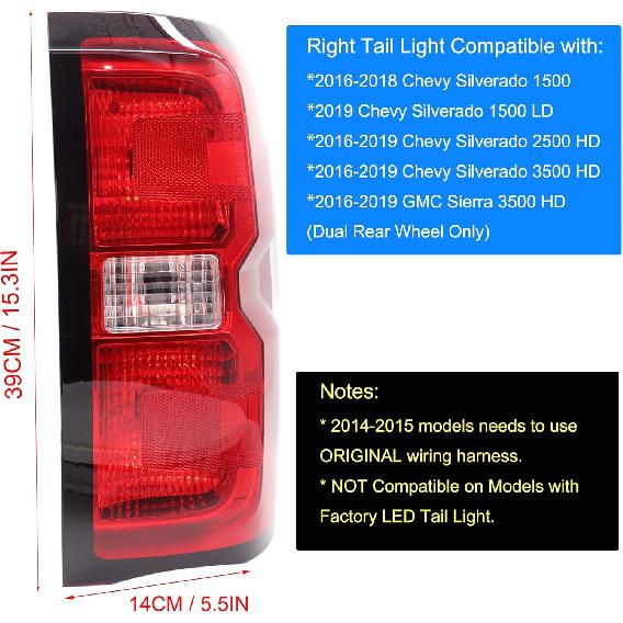 MOCW Right Tail Light Compatible with 2014-2018 Chevrolet Silverado 1500 2500 HD 3500HD, GMC Sierra 3500 HD Taillight Brake Lamps Halogen Bulb and