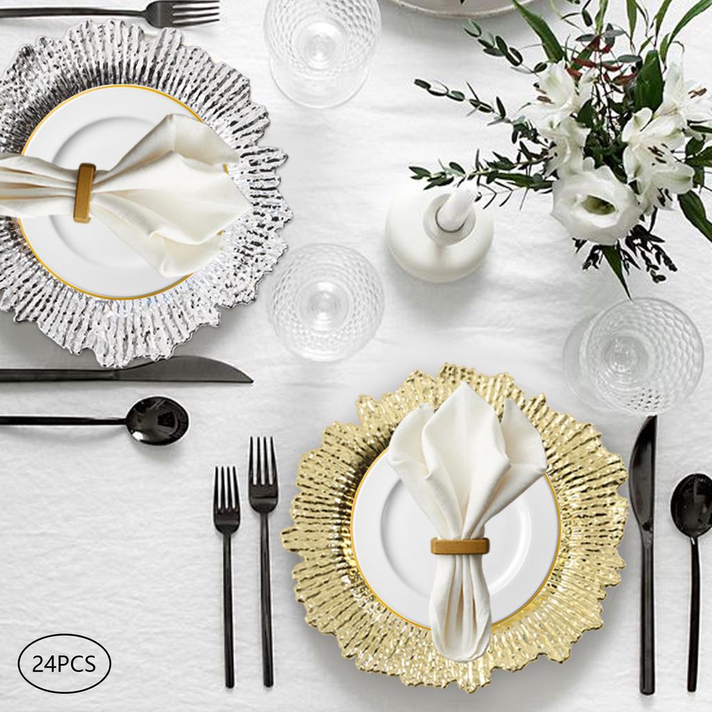 24Pcs13Inch Antique Charger Plates Bulk Round Plastic Dinner Plate Embossed Rim Server Plate Decorative for Dinner Parties
