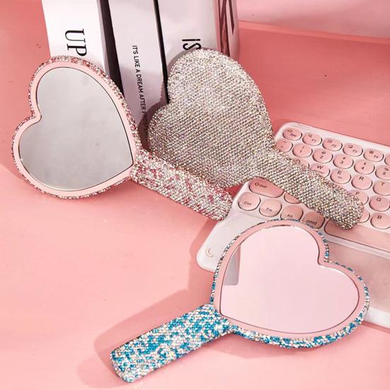 Glitter Rhinestone Makeup Mirror with Long Handle High Clarity Portable Women Vanity Mirror Round Love Heart Square Handheld Cosmetic Mirror