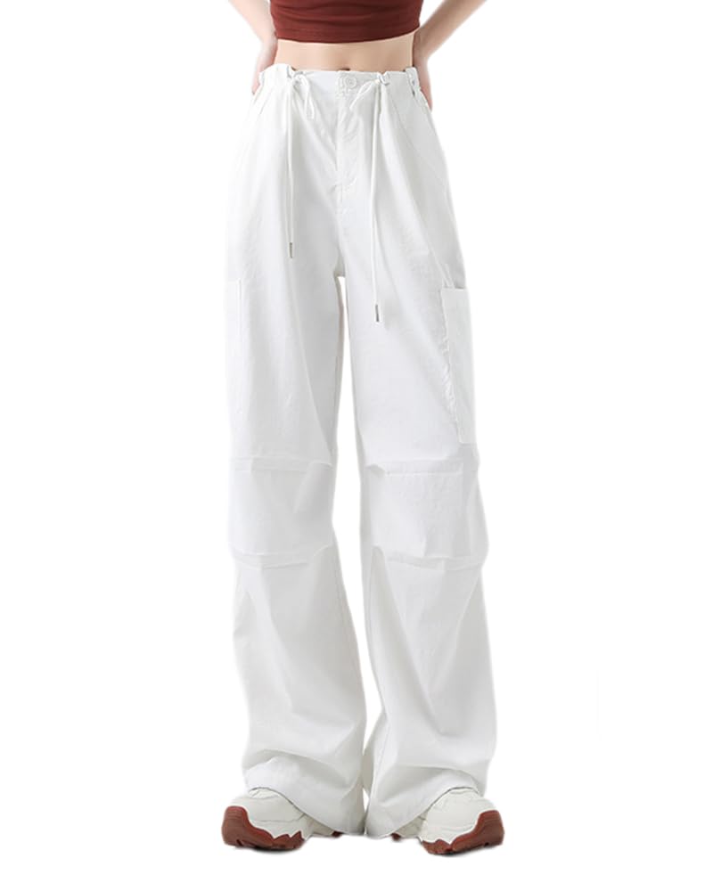 LUJPOIR Cargo Long Pants with Elastic Waist and Adjustable Relaxed Loose Solid Color White Size M Women's Pants, Drawstring, Fit, Casual, Fit, Spring,