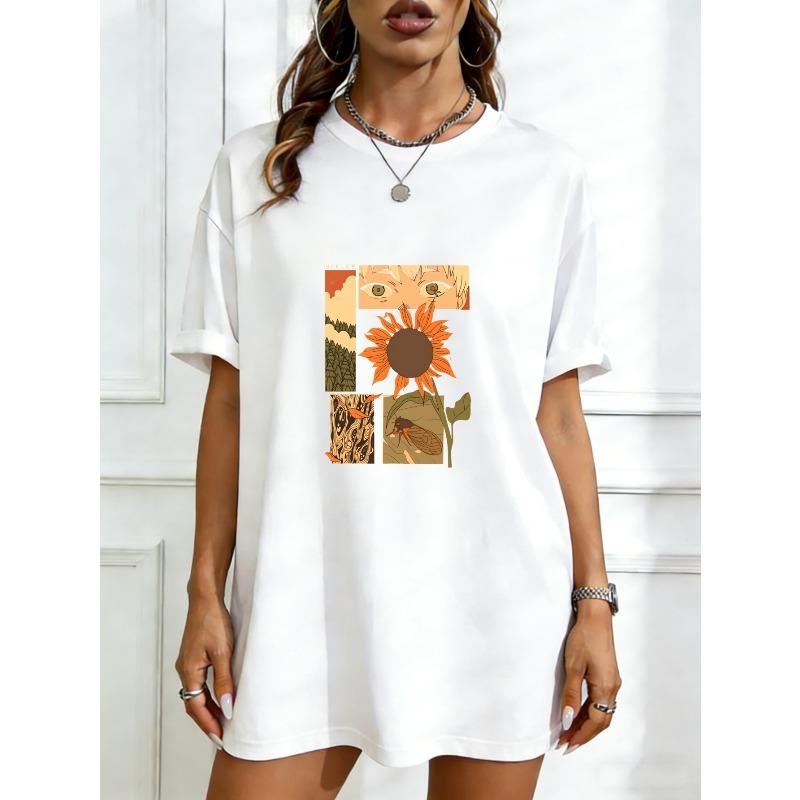 Oversized T Shirt Black Sunflower And Eyes Art Print Graphic Tee For Casual Wear