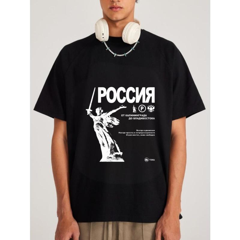 White T-Shirt Russia Statue and Text Print Casual Streetwear for Men