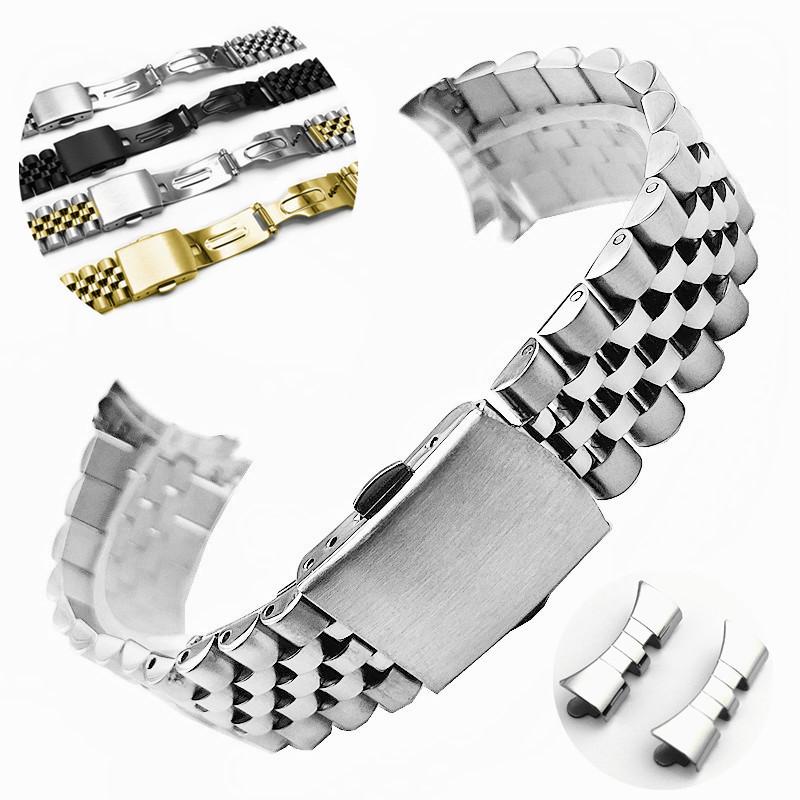 Universal Stainless Steel Bull Ring Watch Band with Curved Ends and Double Push Butterfly Clasp - 18/20/22mm