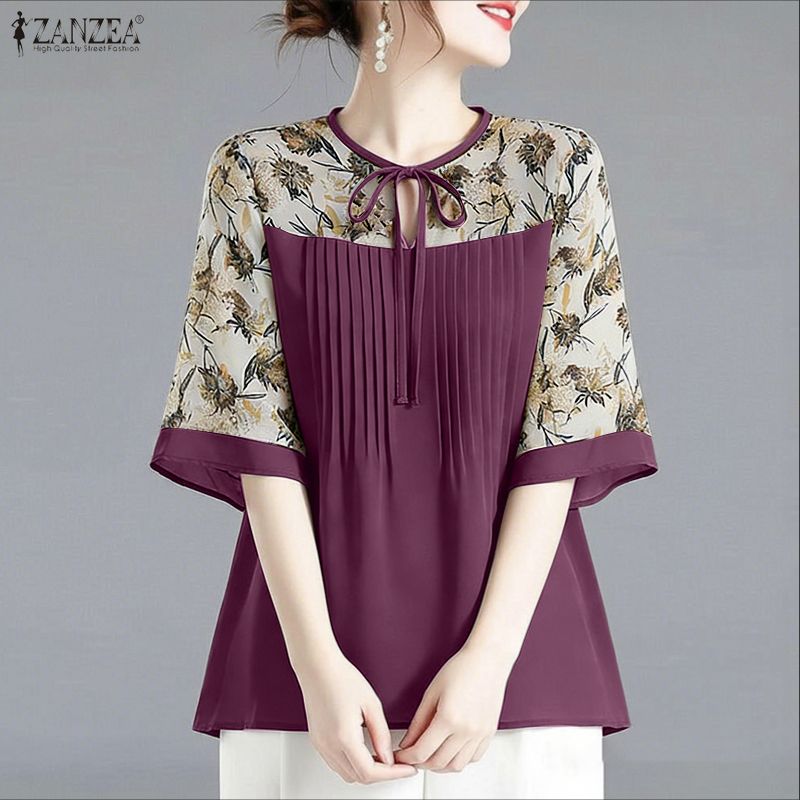 ZANZEA Women Casual Round Neck Print Splice Loose Half Sleeve Blouse