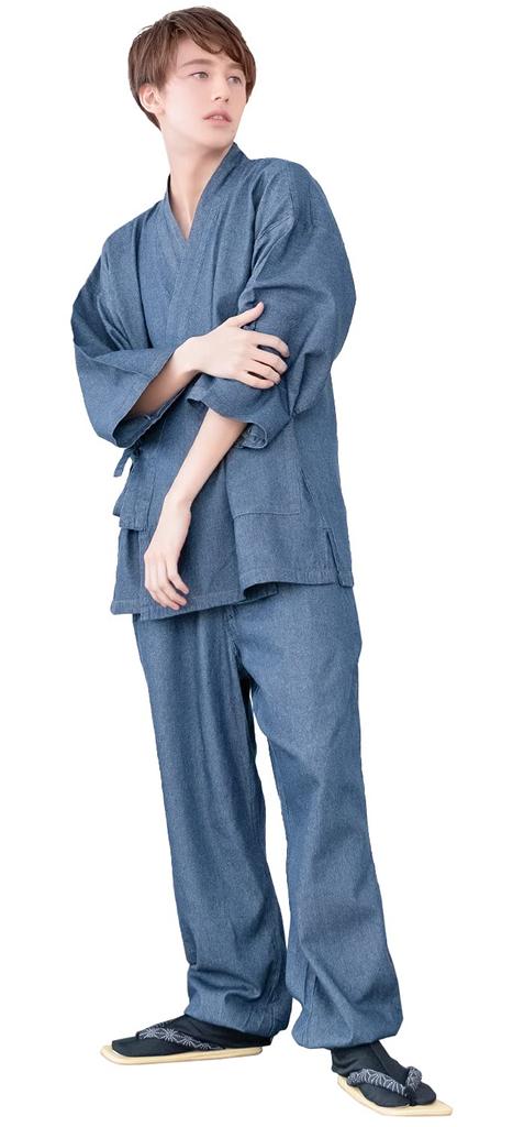 KYOETSU Men's Washable Denim Samue (Work Clothes), Solid Color, 100% Cotton, Year-Round, Light Blue (Size L)