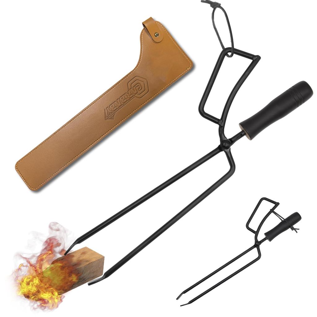 CARBABY Firewood Tongs, Fireplace Tongs, Charcoal Tongs, BBQ Carbon Tongs with Spring, for BBQs, Fireplaces, and Camping, with Storage Cover (Steel)