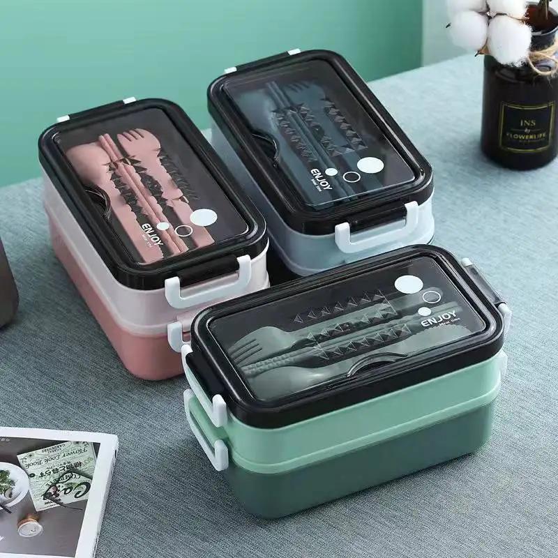 1pc 1400ml Double-layer Lunch Box Portable Compartment Food Box Microwave Lunch Box With Fork Chopsticks And Spoon Picnic Fresh