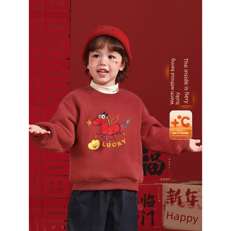 Boys' New Year Fleece-Lined Sweatshirt, Thickened Cartoon Baby Winter Clothing, Children's New Autumn and Winter Red Top, Trendy