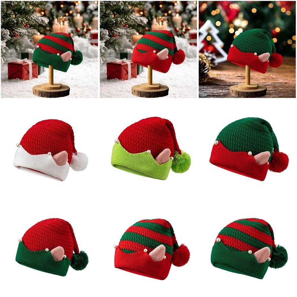 Striped Pattern Christmas Hat Knitted Wool Ball Xmas Cap Jacquard with Small Ears Knitted Hat Festival Girls
