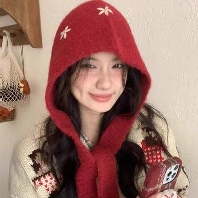 New Year's Red Hat Scarf One Piece Women's Winter Korean Style Warm Knitted Woolen Hat Ear Protecting Balacrafa