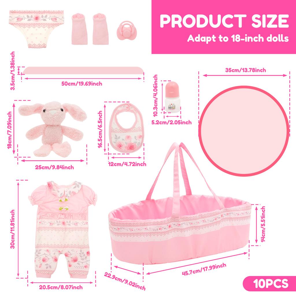 10 Pcs Doll Clothes Set Portable Baby Doll Accessories Set with Bassinet Diaper Pacifier Feeding Bottle for Children Toddler