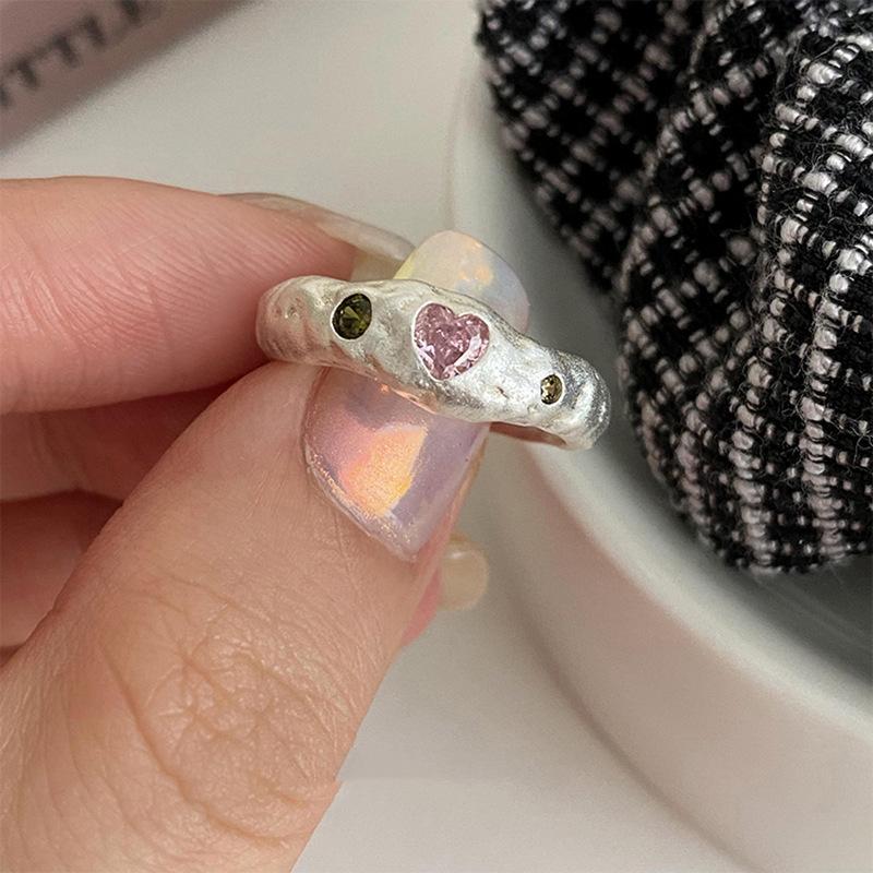 Irregular Texture Pink Diamond Love Ring Female Ins Wind Senior Sense Niche Personality Sweet Lava Texture Opening Casual Dainty Minimalist Ring
