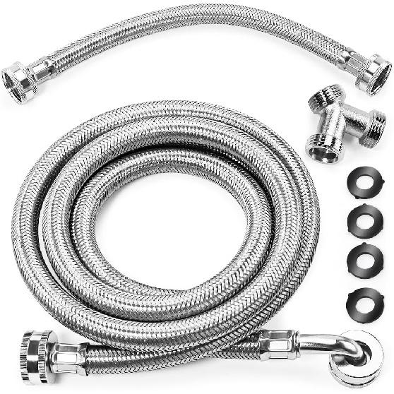 【6FT STEAM DRYER HOSE INSTALLATION KIT】-- Steam dryer hose kit includes 1* 6FT stainless Steam Dryer hose (with 90 Degree Elbow 3/4 inch FHT connection), 1 *1 FT adapter hose,1 * brass Y connector, 4* rubber washers.Space-saving design with 90-degree elbows and rubber gaskets ensure no leaks.