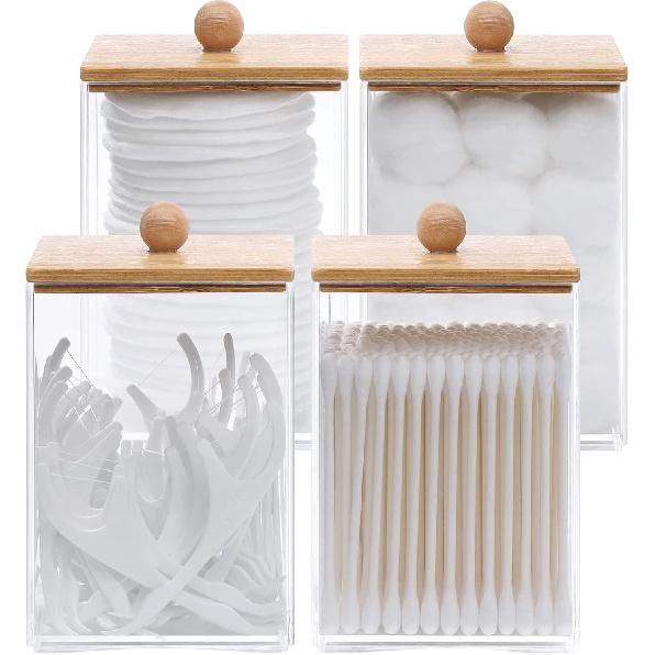 Tbestmax 12 OZ Cotton Swab/Ball/Pad Holder, Qtip Apothecary Jar, Clear Bathroom Containers Dispenser for Storage 4 Pack Wood Lids