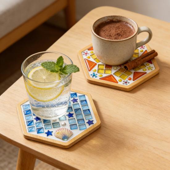 Unwind and unleash your creativity with this Mosaic Coaster Kit, designed for adults seeking a relaxing and rewarding puzzle experience. Transform plain wooden coasters into stunning personalized masterpieces through a simple four-step process: apply glue, arrange mosaic tiles, let dry until clear, then fill gaps with caulk and clean excess for a perfect finish.