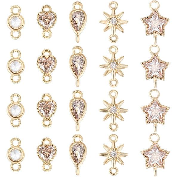BENECREAT 20Pcs 5 Style 18K Gold Plated Links Flat Round Star Brass Micro Pave Cubic Zirconia Links Teardrop Heart Shape Connecter for Necklace