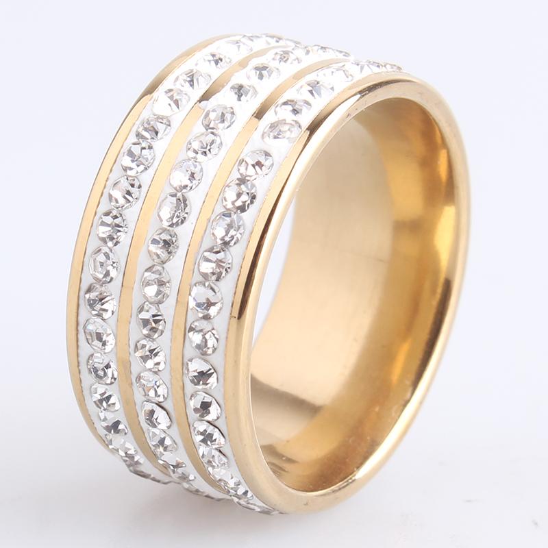 9mm Gold Color Clay Three Row Crystal Stainless Steel Wedding Rings for Men Women