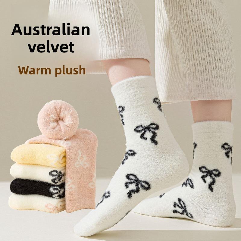 Sock Children's Mid-length Winter and Autumn Thickened Fleece-lined Warm Floor Socks with Bows, Versatile for Home Use and Sleepwear, for Women.
