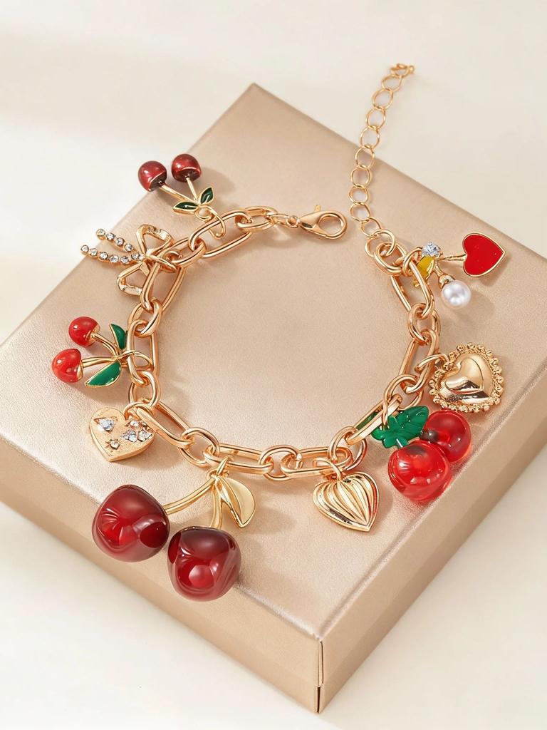 Sweet Cute Red Strawberry Cherry Bracelet for Women Girl Handmade Imitation Pearl Heart Pendant Bracelet Friendship Jewelry Gift