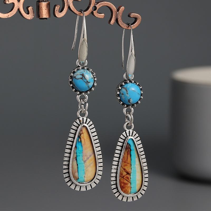 Ethnic Water Droplets Blue Stone Earrings Vintage Originality Silver Color Metal Carving Pattern Personality Dangle Earrings