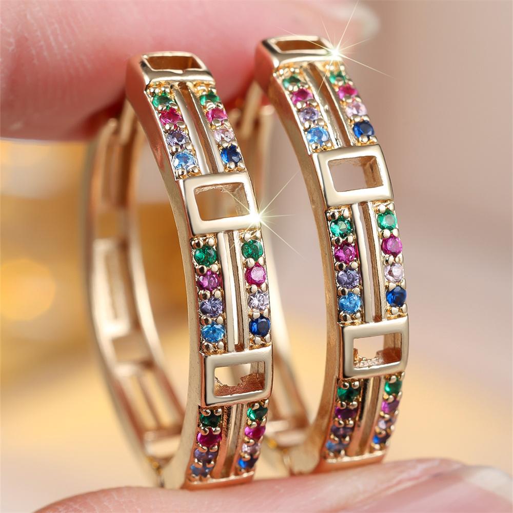 Trendy Hollow Square Rainbow Zircon Round Stone Hoop Earrings For Women Vintage Gold Color Small Ear Buckle Wedding Jewelry Gift