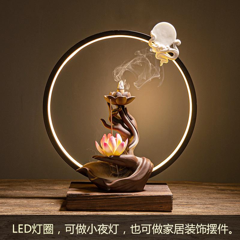 Feng Shui Chinese-style Purple Clay Inverted Flow Incense Burner, Zen-inspired Buddha's Hand Lotus Heart Lamp Ring Ornament, Cer