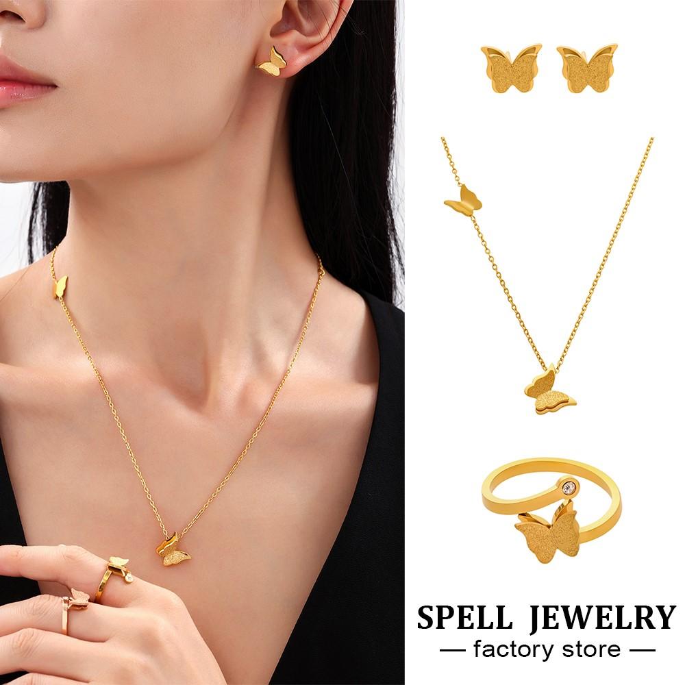 Butterfly Stud Earring Rings Necklace In 18k Gold Plated Stainless Steel Chain Necklaces Matching Ring Ear Studs For Women