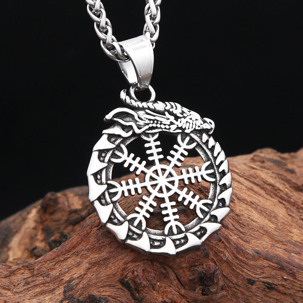 Vintage Vikings Dragon Ouroboros Pendant Necklaces For Men Stainless Steel Nordic Viking Compass Necklace Amulet Jewelry