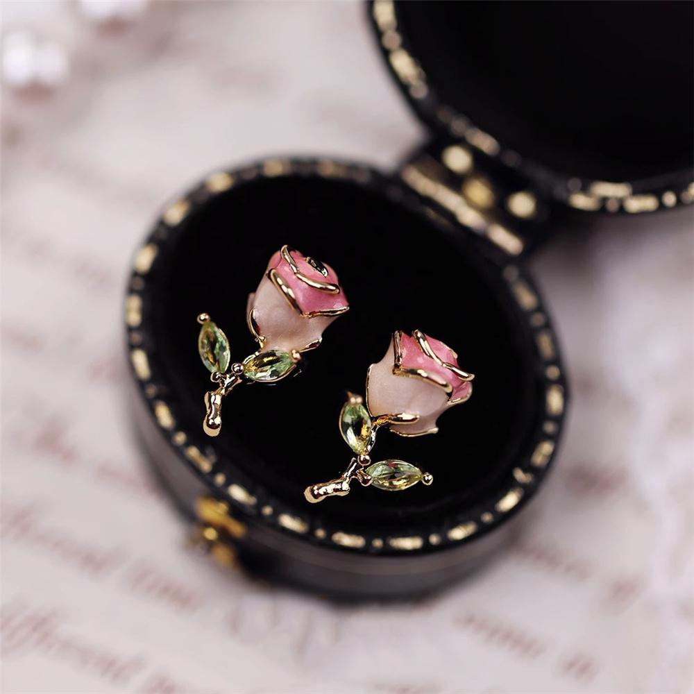 Cute Female White Enamel Gold Color Pink Flower Stud Earrings Lovely Bridal Wedding Jewelry For Women