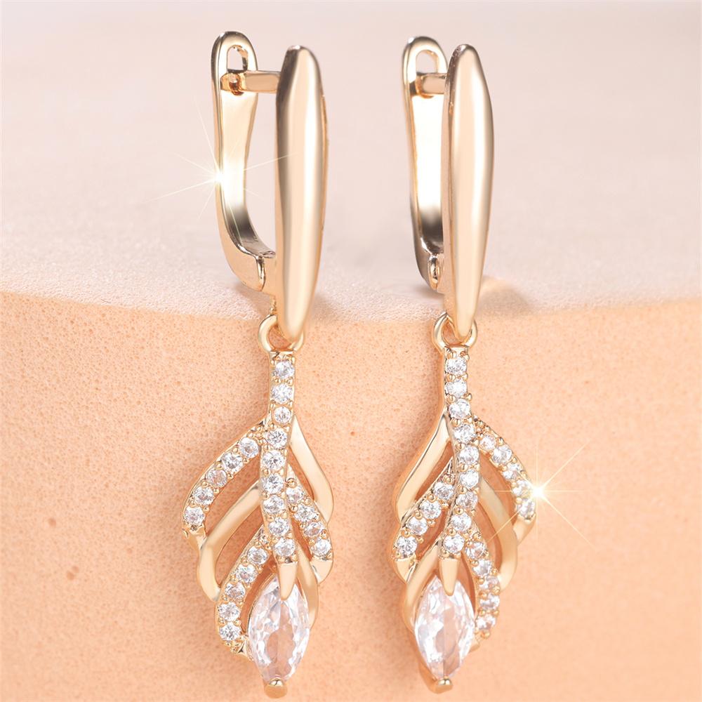 Water Drop Tassel White Zircon Leaf Pendant Hoop Earrings For Women Gold Color Ear Buckle Wedding Jewelry Engagement Party Gifts