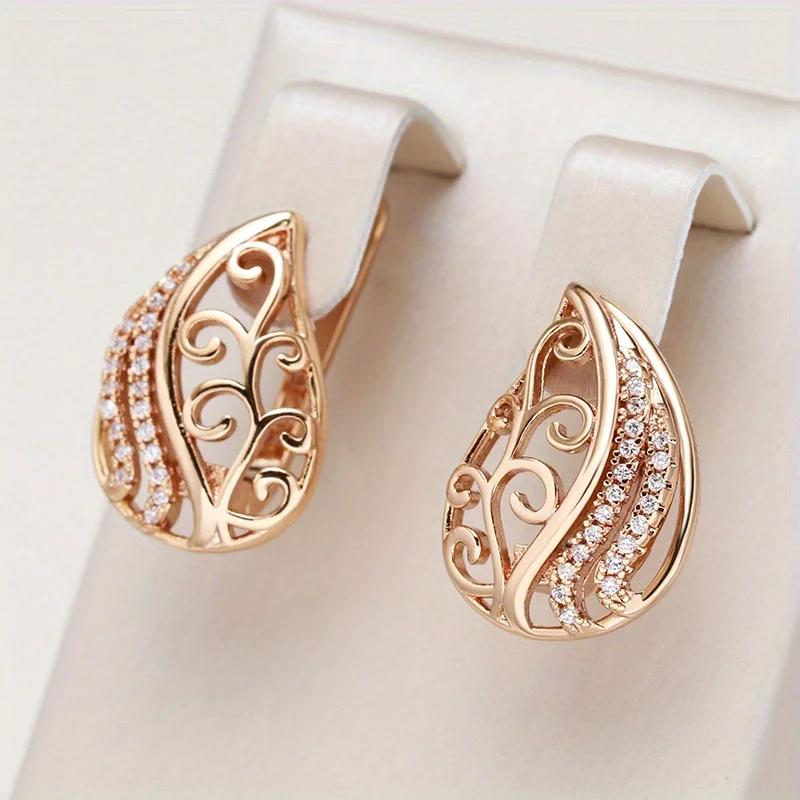 Elegant Exquisite Synthetic Zirconia Teardrop-shaped Hollow Hoop Earrings Women Hand Carved Golden Plated Jewelry Crafts