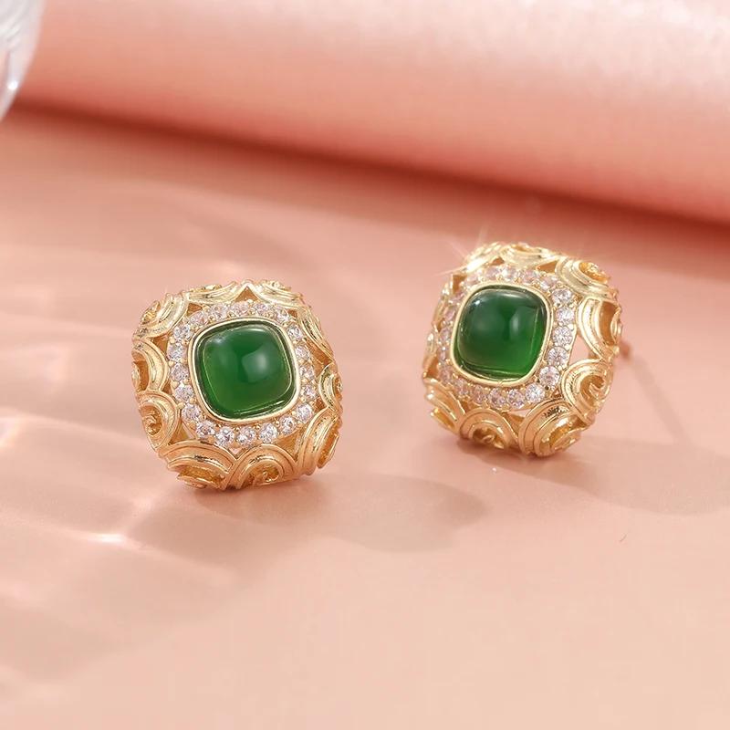 Exquisite Vintage Hand Carved Stud Earrings for Women's Elegant Green Square Chalcedony Ear Stud Perfect Christmas Gifts