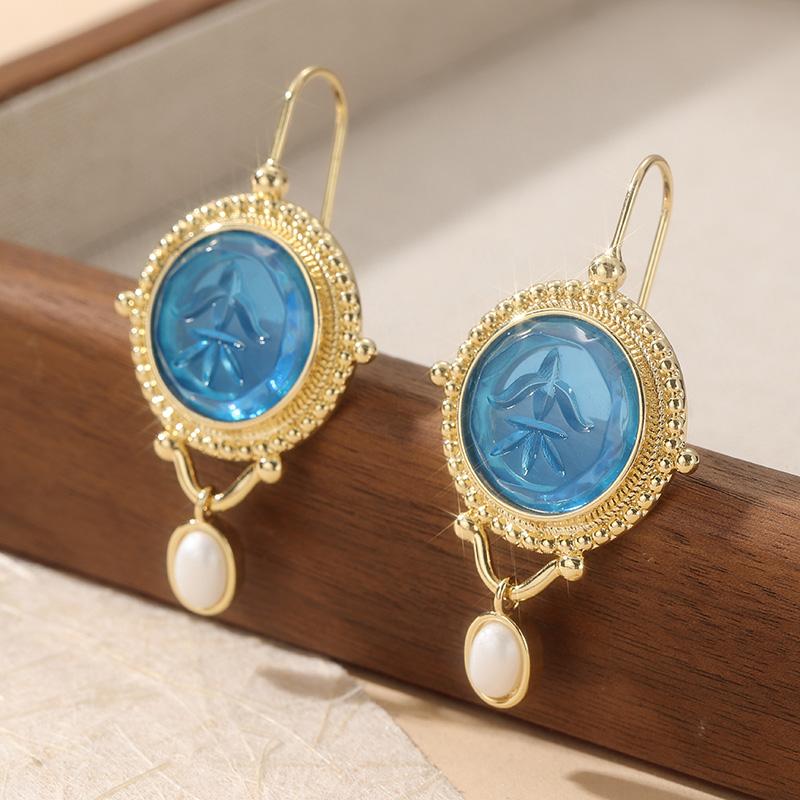 Vintage Imitation Pearl Inlaid Synthetic Aquamarine Dangle Earrings for Women Exquisite Banquet Pendant Jewelry Crafts