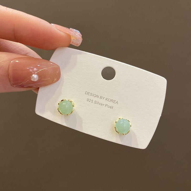 Vintage French Green Chalcedony Stud Earrings for Women's Cold Wind Earrings Autumn and Winter Ears