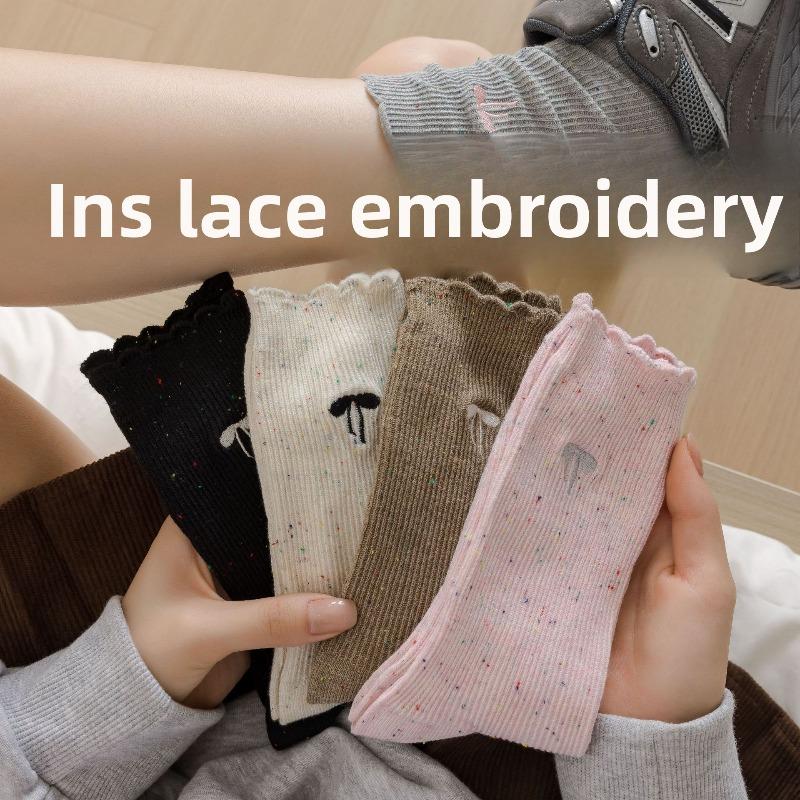 Pointed Yarn Pile Socks - Children's Autumn and Winter Embroidered Bow Tie Mid-calf Socks, Trendy and Versatile Lace Long Socks