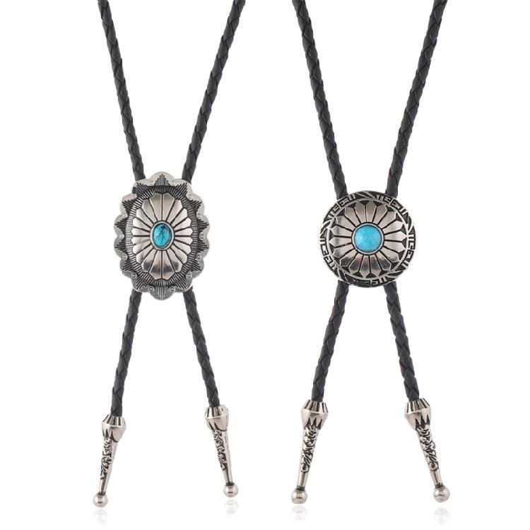 Turquoises Flower Pendant Bolo Tie Necklace For Men Women Cowboy Adjustable Leather Cord Necktie Casual Evening Wear