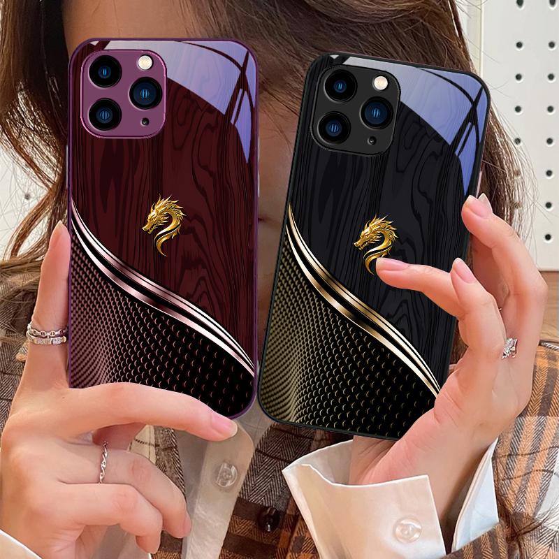 Wood Grain Dragon Rose Purple For IPhone 15 Pro 14 13 12 Mini 11 XS Max XR 7 8 Plu SE 2020 2022 Tempered Glass Phone Case