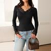 Women's Color V,Neck Lace Trim Blouse With Gathered Waist And Long Sleeves
